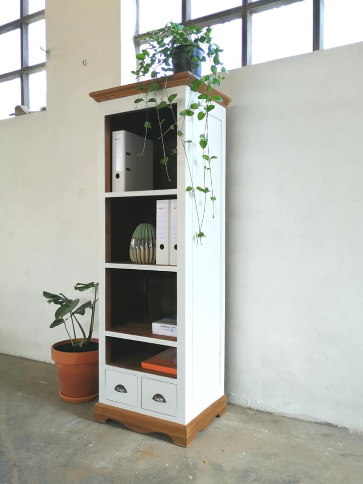 En esta pieza hemos reconstruido toda su estructura interna para conseguir la altura necesaria para adaptar los archivadores. También hemos rebajado los cajones y los hemos colocado en la parte inferior para ganar todo el espacio posible.